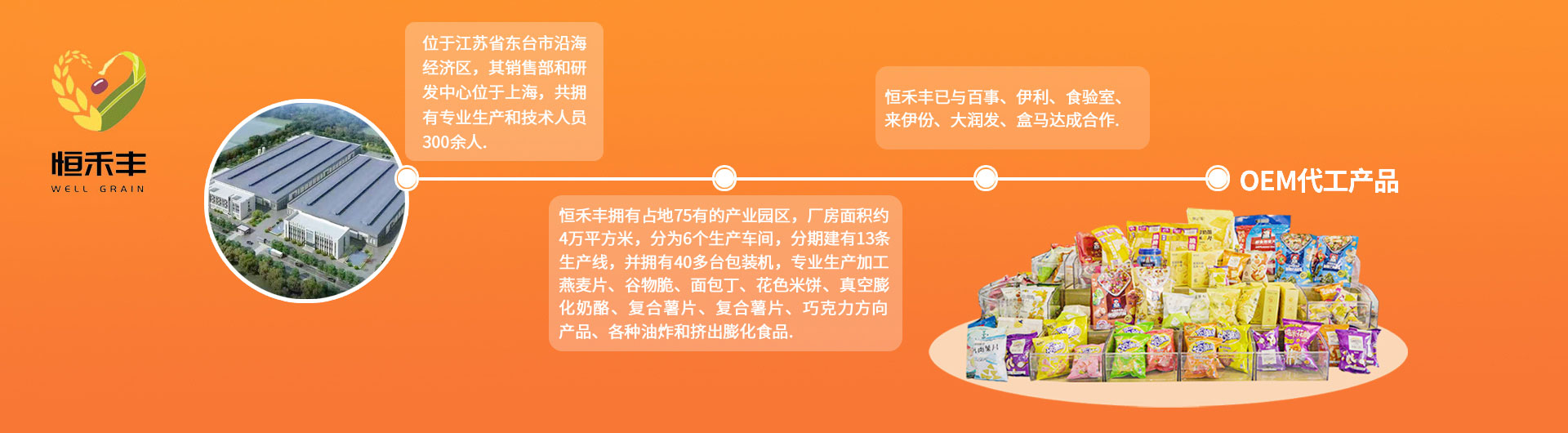 目前,恒禾豐擁有占地75畝的產(chǎn)業(yè)園區(qū),廠房面積約4萬平方米,分為6個生產(chǎn)車間,分期建有13條生產(chǎn)線,并擁有40多臺包裝機(jī),專業(yè)生產(chǎn)加工燕麥片、谷物脆、面包丁、花色米餅、低溫真空膨化奶酪及果蔬、各種油炸和擠出膨化食品。